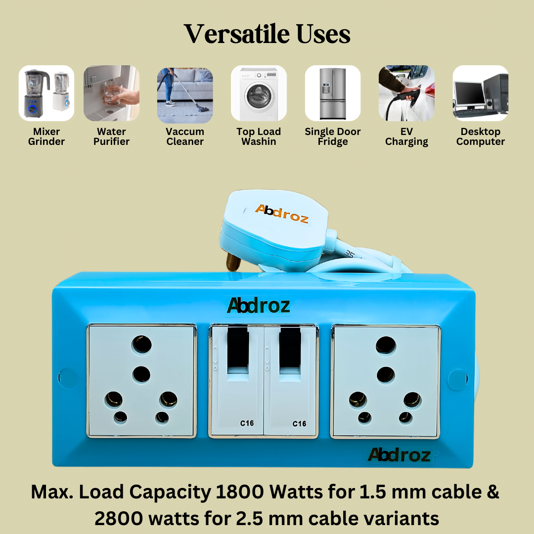Uses: This ABDROZ 16a extension heavy duty switch board protects your appliances from electrical short-circuit because it has MCB. This 16 amp extension board anchor is perfect choice for AC, refrigerator, microwave, induction cooker, washing machine, electric iron, mixer grinder, TV, Computer or any other home appliances under 1800 for 1.5mm wire/2800 for 2.5 watts.