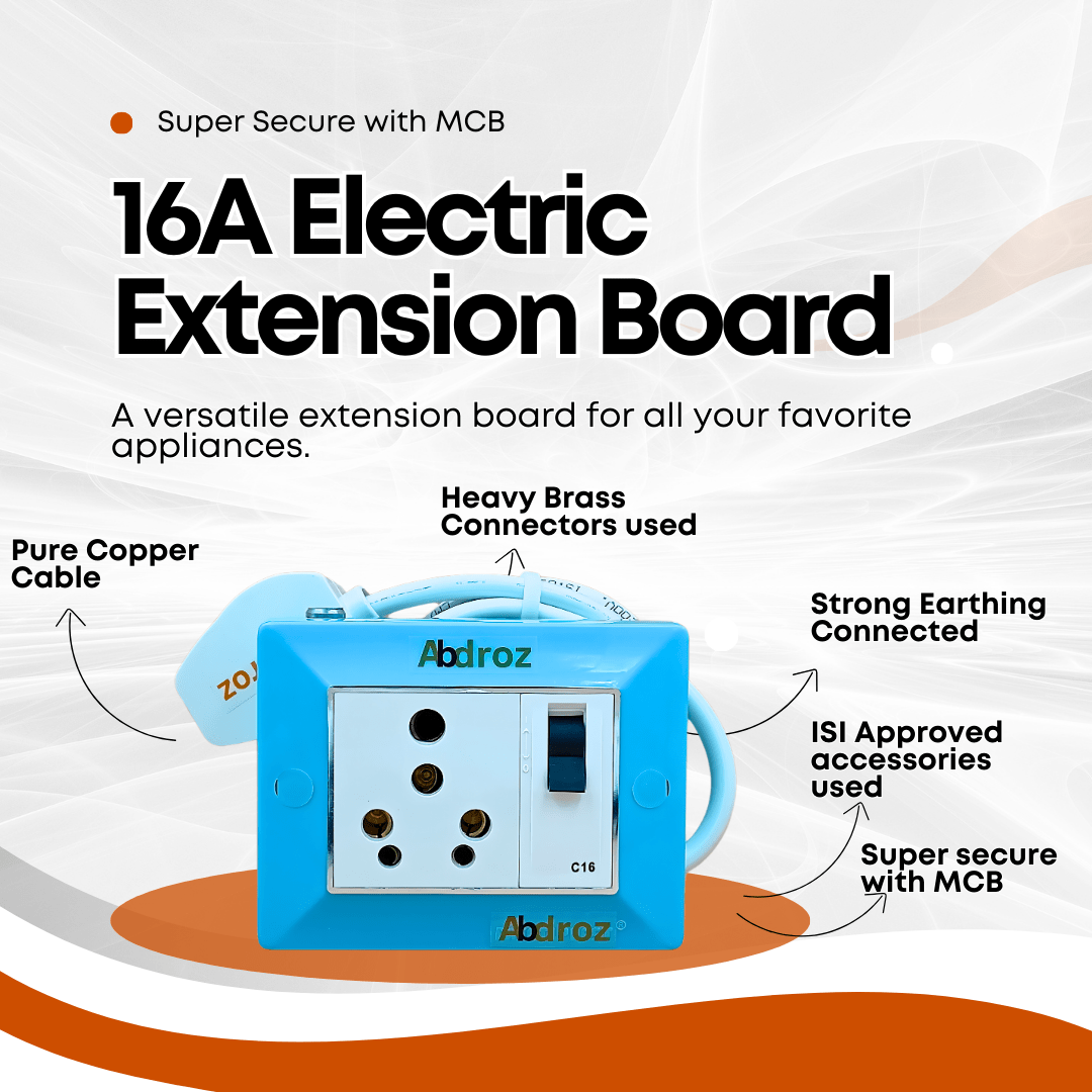1. ABDROZ Electric Extension Board with MCB is made up of Unbreakable white Polycarbonate Material. ABDROZ Electric Extension Board have 16A/20A Sockets with MCB and Heavy-Duty copper Wire.