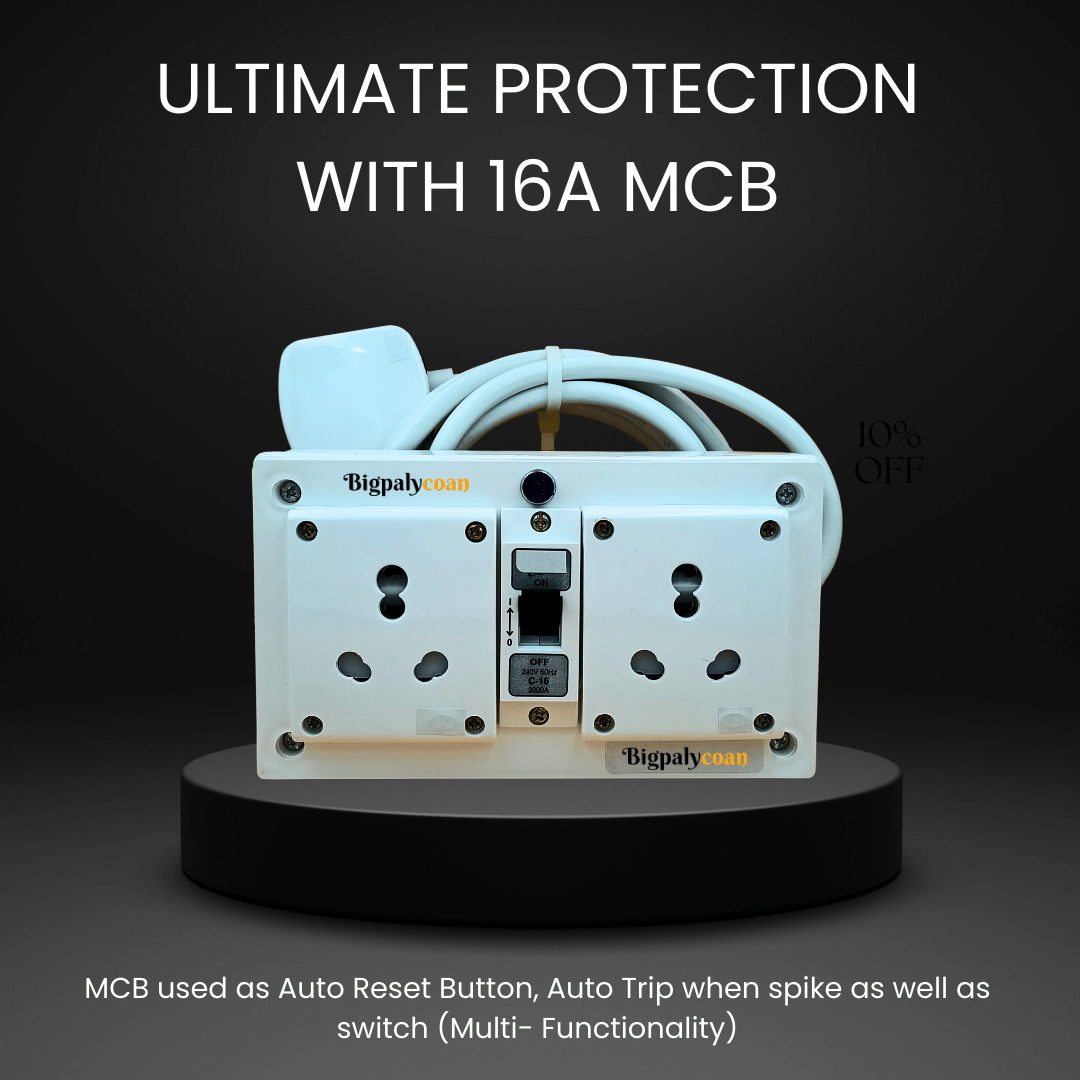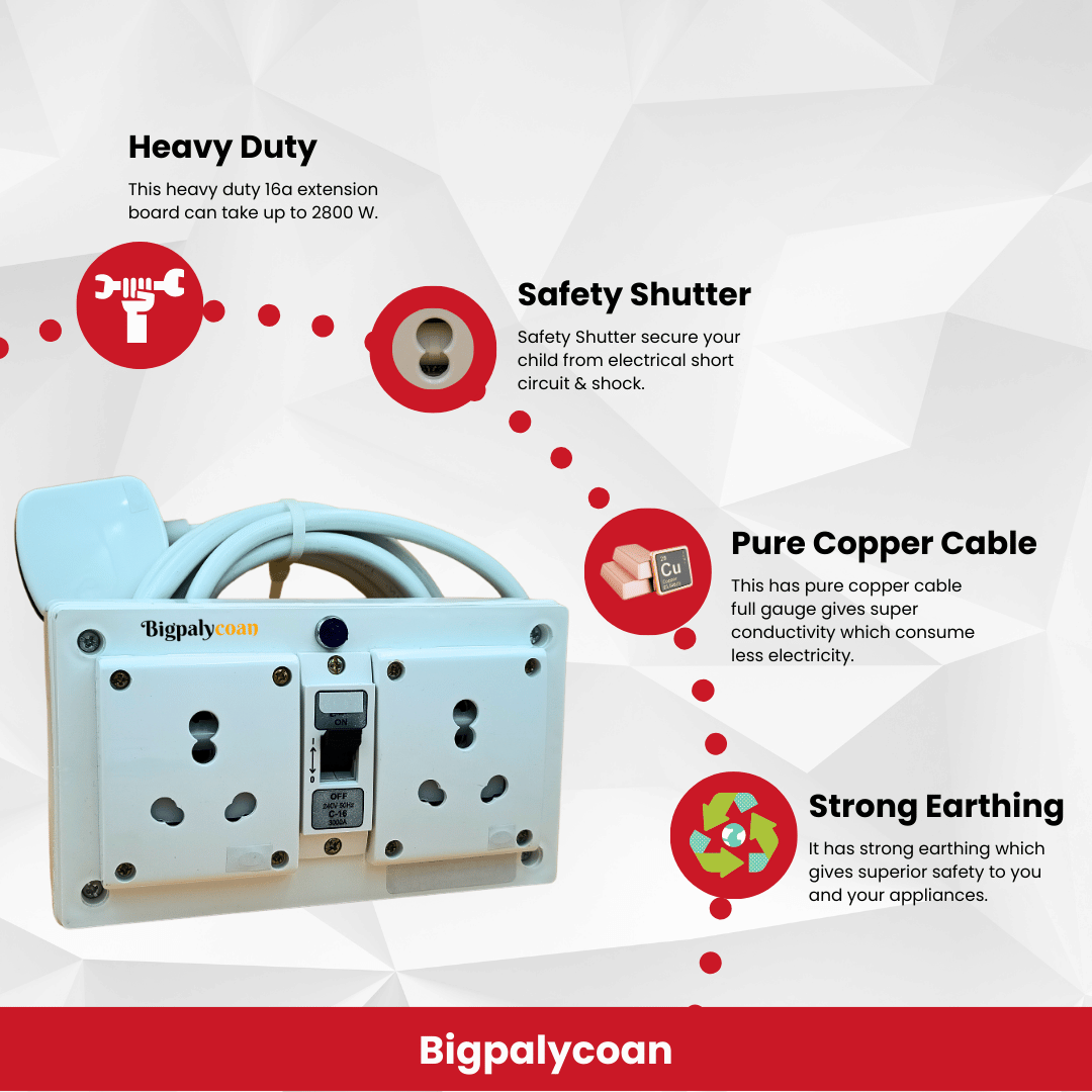 - Uses: This BIGPALYCOAN 16a extension board with mcb protects you and your appliances from electrical short circuit because it has brass connectors. Ac switch board with mcb 1.5 ton is perfect choice for AC, refrigerator, microwave, induction cooker, washing machine, electric iron, mixer grinder, TV, Computer or any other home appliances under 2800 watts 240 volts.