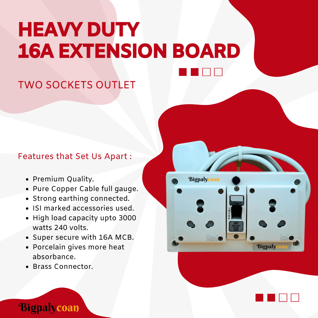 -60%- Materials Used: BIGPALYCOAN 16 amp extension board multi outlets is build with 2 branded ISI marked 16A/20A sockets attached with 1 branded ISI marked 16A MCB. This 15 amp extension box is made of unbreakable white PVC. This contains 3 core pure copper wire of 2.5 mm ISI marked full gauge. Internal wiring is 1.5 mm single core. This power cords is attached with 16A branded ISI 3 pins plug. It has LED indicator to indicate power supply. Ready to use.
