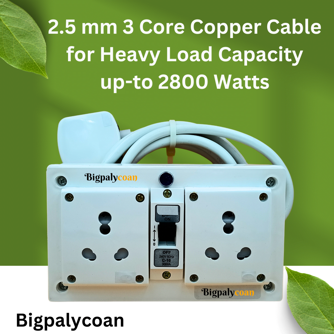 Materials Used: BIGPALYCOAN 16 amp extension board multi outlets is build with 2 branded ISI marked 16A/20A sockets attached with 1 branded ISI marked 16A MCB. This 15 amp extension box is made of unbreakable white PVC. This contains 3 core pure copper wire of 2.5 mm ISI marked full gauge. Internal wiring is 1.5 mm single core. This power cords is attached with 16A branded ISI 3 pins plug. It has LED indicator to indicate power supply. Ready to use.