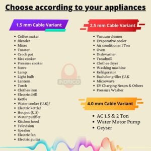 Materials: INDRICO 16 amp extension board is build with 2 branded ISI marked 16A/20A sockets attached with 2 branded ISI marked 16A/20A individual switches. This 15 amp extension cord is made of unbreakable white PVC. This contains 3 core pure copper wire of 1.5 mm ISI marked full gauge. Internal wiring is 1.5mm single core. This power cords is attached with 16A branded ISI 3 pins plug. It has LED indicator to indicate power supply. Ready to use. Choose 1.5mm for 2000W/2.5mm for 3500W total load