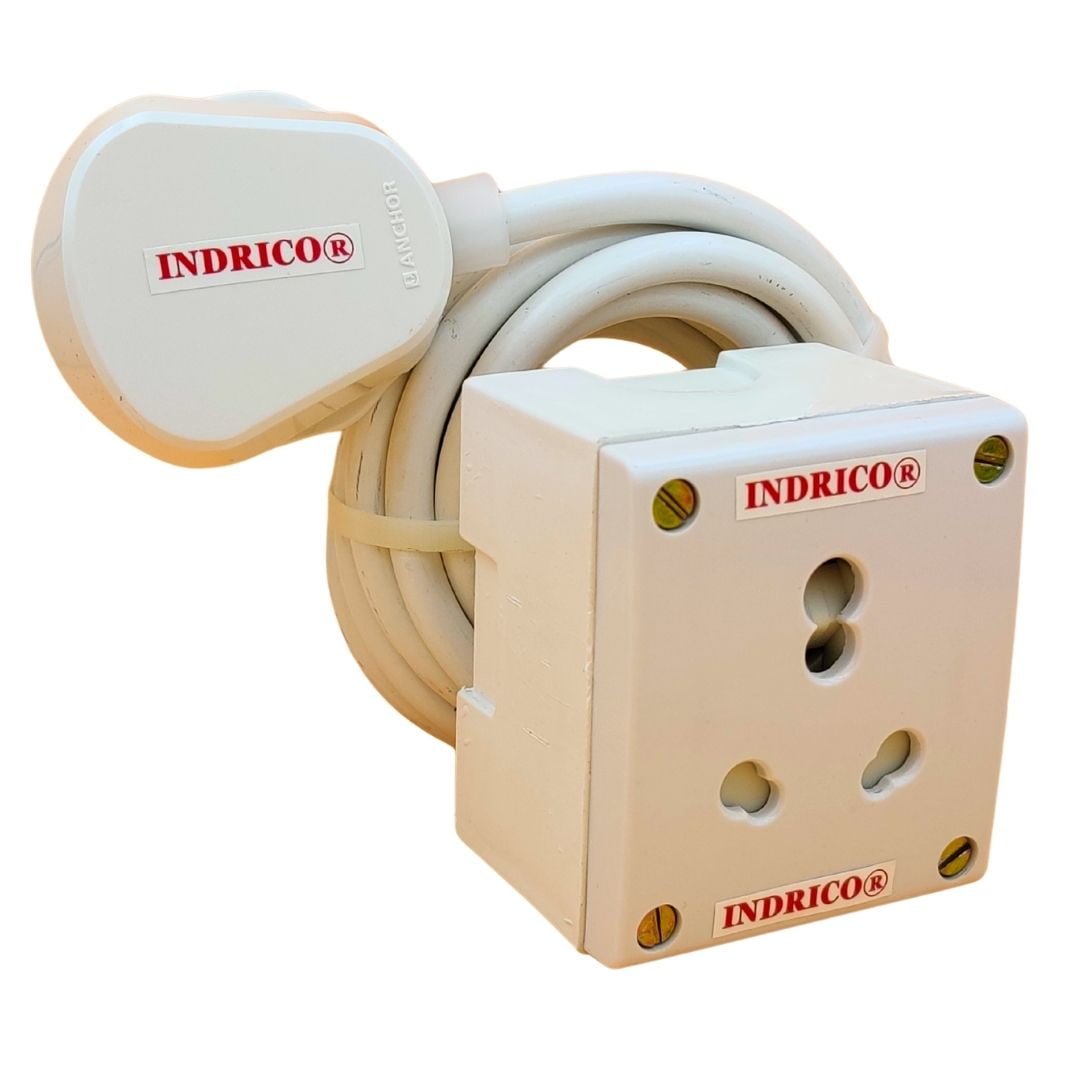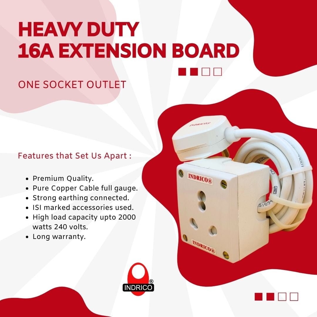 -85%- Materials: INDRICO heavy duty 1 anchor socket extension board is built with 1 branded ISI marked 15A/16A/20A sockets. This 15 amp extension board heavy duty is made of unbreakable white PVC. This contains 3 core pure copper wire of 1.5 mm ISI marked full gauge. Internal wiring is 1.5mm single core. This power cords is attached with 16A branded ISI 3 pins big plug. Ready to use. Maximum 2000 watts 240 volts total load capacity.