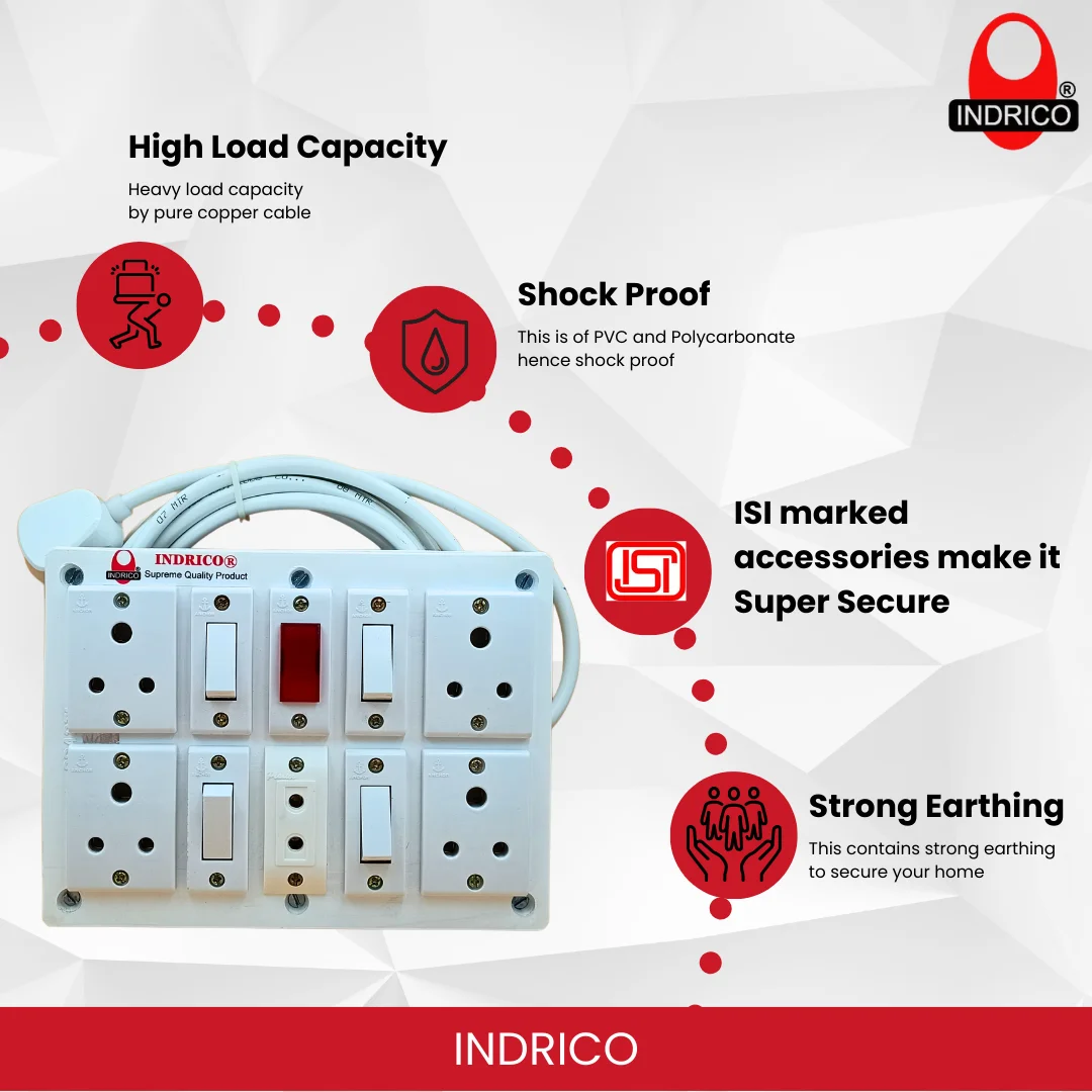 -50%- Materials: INDRICO extension board with individual switch is built with branded ISI marked 6A sockets attached with branded ISI marked 6A switches. This extension board is made of unbreakable white PVC. This contains 3 core pure copper wire of ISI marked full gauge. Internal wiring is 1 mm single core. This power cords is attached with 6A branded ISI 3 pins plug. Ready to use.