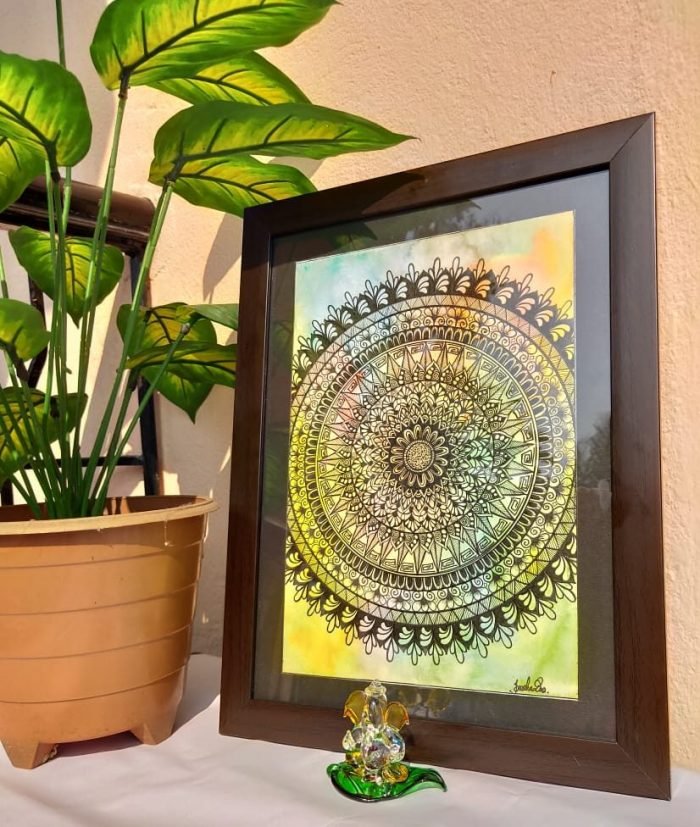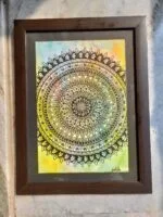 About the drawing: The mandala drawing fully original, handmade. Green and safe materials: Made with an environment and home friendly reclaimed wood. Stylish and Elegant: Make your wall look stylish with our elegantly designed decorative wall hanging. Vibrant and natural: Made with vibrant and natural colours with the inspiration from nature to bring your wall to back to life. Easy to handle: Hook at the back and packing material that keeps your product intact. Perfect gift: A perfect gift for everyone and every occasion. Our wall hangings make an ideal such as birthday, festival, marriage, anniversary, as well as wall decor for living room, bedroom, kitchen, dinning room, office, hotel, restaurant. Features & details: Size Stretched and framed, ready to hang. Wrapping in soft paper and packed with bubble wrap for reaching you safely. Material: Reclaimed wood. Instruction: Hook attached at the back, for ease of use. 0ur process All products are hand made in India with love and care. Each product is made just for you when you place an order. It will be made in a sustainable and a more personal manner and hand crafted. Just the way it should be. mandala painting, mandala painting with frame, mandala painting for living room, mandala paintings for wall, original painting, original paintings by artists, original paintings for living room, original paintings for sale, original paintings with frame,