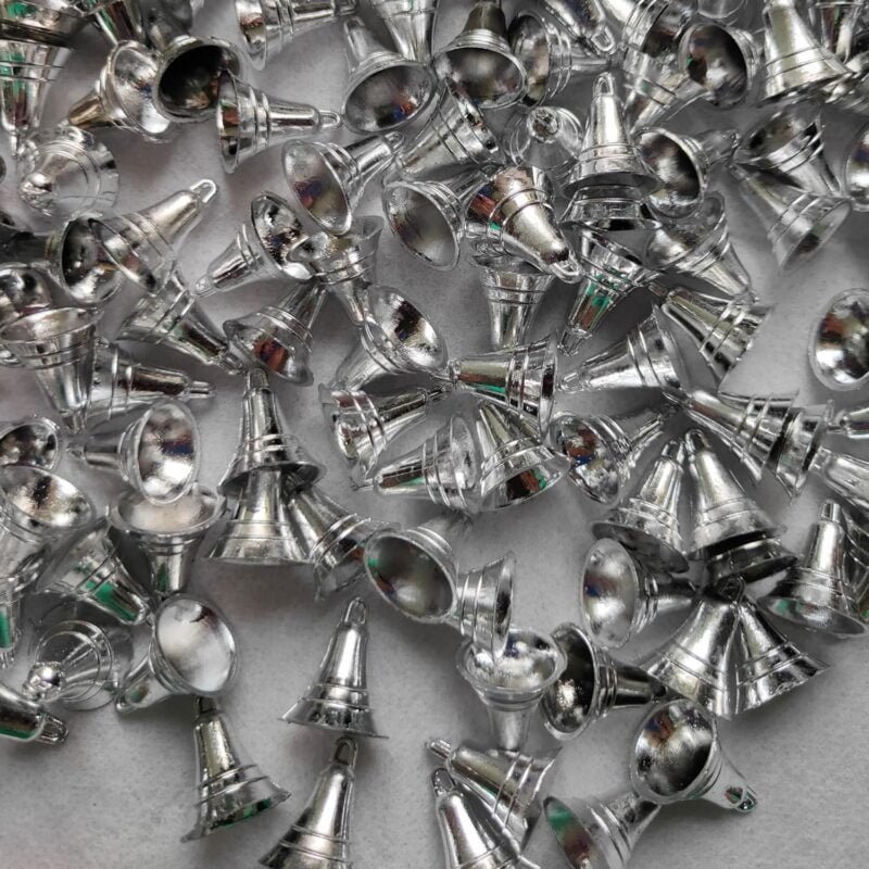 Package Include: 50 pcs of Silver plastic bell for diy, art, craft, home décor, Christmas tree decoration etc.
