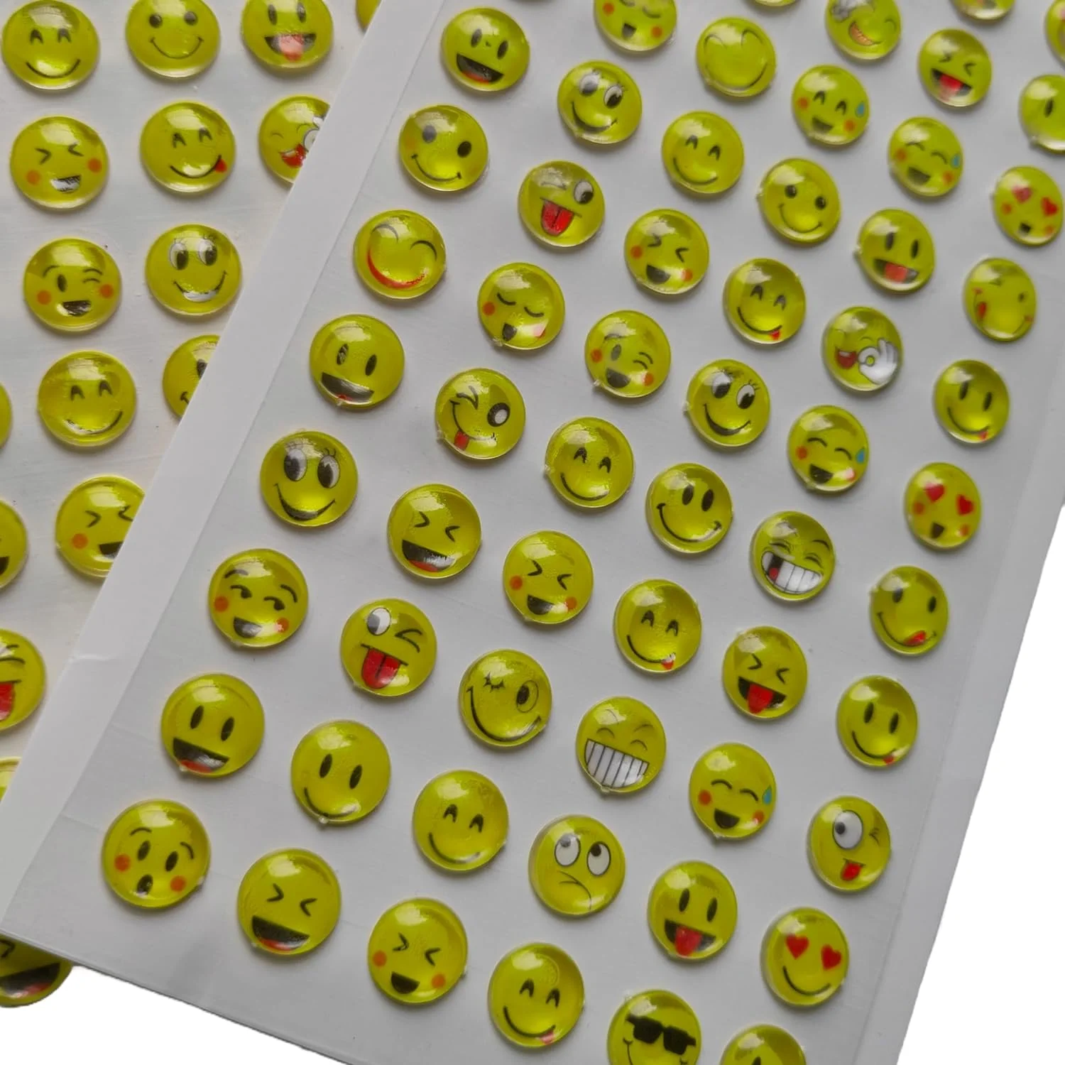 - The stickers are likely made of a transparent material with a holographic or glittery finish that gives them a crystal-like appearance. They come in a variety of different emoji designs, including smiley faces.